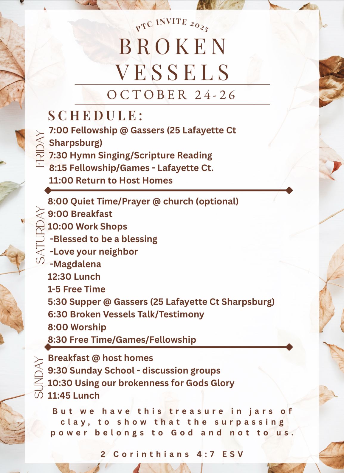 The 2025 Young Group Invite is quickly approaching. The invite is planned for the weekend of October 24-26. ALL are welcome and encouraged to participate, the Young Group would love the participation of the church in this weekend. In order for those planning the food to know how much they need to prepare, we would greatly appreciate if you could fill out the form below with the meals you plan to be at & the number of people in your family that we should plan for during the weekend if you plan to eat at any meals.